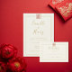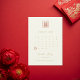 En modern design med dubbel lycka symbol på röd med elegant typografi i guld på en elfenbensvit bakgrund.