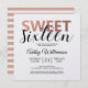 En modern chic ser söt ut 16 födelsedagsfest inbjudan med sweet sixteen i faux ro guld foil och svart. Du kan enkelt lägga till egna personuppgifter till eleganten sweet sixteen födelsedagsfest inbjudan. Kortets baksida har en snyggt rosa och vit rand mönster. Om du behöver hjälp eller matchande produkter kontaktar du oss genom vår butik.