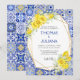 Transport dina gäster till den idylliska italienska kusten med den här vibrerande bröllopsinbjudan. Denna design har en bakgrund av klassiska blå Medelhavsbrickor, som påminner om de färgstarka keramik som finns i hela regionen. Mot den bakgrunden är gula blommor och citruscitrusfrukt i pulverform. guld ram lägger till en aning lyx, perfekt för en sommar eller ett målbröllop någonstans.
