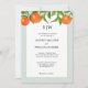 Elegant Orange citrusfruktens vattenfärgsinbjudningar, underbar för sommartid i bröllop. Inbjudan innehåller vattenfärgsillustrationer av frukt och löv i orange med blek aqua gräns.