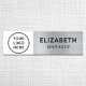 Modern namn bricka med företagets eller organisationens logotyp. Lägg till en namn och titel i enkel typografi mot en borstad silver-faux-bakgrund.