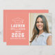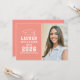 Meddela din högskola eller högskola student i stil med detta tillkännagivande och denna partiinbjudan från studenten. Dubbelsidiga kort har en hög porträtt i student med gradsockel och enkel och modern vit typografi. Du kan ändra bakgrunden för lax eller korall orange/rosa till ett annat färg med funktionen "Anpassa den" och sedan Redigera/Bakgrund för att välja ett annat färg.