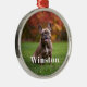Modern Custom Name Photo Holiday metal ornament with your pet’s name in a bold white serif font.
