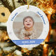 Trendig, elegant och söt personlig Första julen Pojke Ornament för ett moster med ett vitt ram med snöflingor och stjärnor som har en rundöppning för ett vågrät för anpassningsbar framtill och baktill, och ett böjt blått band på vardera sidan som visas namnen på babyen med ett typsnitt/typografi för elegant, och på baksidan anpassningsbarna "Första jul 202X "(se till att du anpassar året!). På framsidan finns ord "I kärlek you, Moster Johanna!", som du kan anpassa eller ta bort.