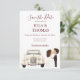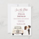 This elegant save-the-date wedding invitation features a timeless design centered around a beautifully illustrated antique wedding car, evoking a sense of vintage romance and charm. Beside it, a bride and groom share a tender kiss, capturing the joy and intimacy of the special moment. The text is presented in a rich Burgundy hue, adding warmth and sophistication while standing out gracefully against the background. Thoughtfully designed to be fully customisable, every detail—from names and dates to key information—can be tailored to reflect your unique celebration.