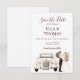 This elegant save-the-date wedding invitation features a timeless design centered around a beautifully illustrated antique wedding car, evoking a sense of vintage romance and charm. Beside it, a bride and groom share a tender kiss, capturing the joy and intimacy of the special moment. The text is presented in a rich burgundy hue, adding warmth and sophistication while standing out gracefully against the background. Thoughtfully designed to be fully customisable, every detail—from names and dates to key information—can be tailored to reflect your unique celebration.