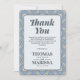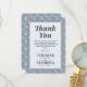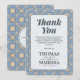 Uttryck din hjärtliga tacksamhet med detta moderna dammiga blå Art Deco-bröllop tackkort. Med det signaturmönster med sammanlänkade geometriska former i stålblått och sandbeige ger detta kort en sofistikerad och sammanhängande finish till din bröllopsbrevpapper. Framsidan erbjuder ett rent, elegant utrymme för ditt tackmeddelande, medan baksidan visar en minimalistisk cirkulär monogram för en personlig touch. Perfekt för par som firade ett chic, modernistiskt eller arkitektoniskt inspirerat bröllop. Detta dubbelsidiga kort är helt anpassningsbart, så att du kan lägga till dina namn och ett personligt tack till dina kära gäster.