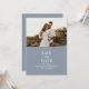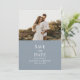 Meddela din speciella dag med stil med vårt moderna dammiga blå anpassade foto spara datum kort. Den övre halvan visar ett foto, kompletterat med vit text mot en dammig blå bakgrund nedan. Baksidan visar eleganta vita monogram på en dammig blå bakgrund. Ett chic och personligt sätt att markera ditt bröllopsdatum.