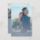 Uttryck din uppskattning på ett stilfullt och personligt sätt med vårt hjärtliga Bröllops-Tackkort. Denna unika design har en dammig blå gradientbakgrund, två älskade foton, fram och bak, och ett elegant skrivsätt som lyder "Tack" med en hjärtaccent. Det är ett vackert sätt att förmedla din tacksamhet och dela kärleken från din speciella dag. Anpassa med dina egna foton och text.