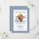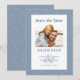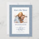 Lägg till ditt eget foto på vårt trendiga "save the date"-fotobryllopskort med ett modernt abstrakt bladsmönster på en trendig dammig blå bakgrund. Kraftfullt skrivsätt och typsnitt är i dammig blå på vit bakgrund. En trendig mall kompletterar den unika designen med skrivstil. En modern mall för datum och år kompletterar den unika skrivstilen och parets förnamn visas ovanför ett koordinerande et-tecken. Baksidan av kortet upprepar bladsmönstret på blå bakgrund. Anpassa med ditt favoritförlovningsfoto för att tillkännage er stora dag! (För bästa placering av din bild, använd ett fotoredigeringsverktyg för att centrera och beskära INNAN du laddar upp till Zazzles webbplats.) Se länken till samlingen på denna sida för att se alla matchande artiklar