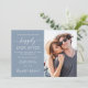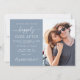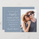 Modern dammig blå bröllopsinbjudan med möjlighet att spara datum med er egen foton och texten "Happily Ever After" i en mix av enkel vit typografi och ett elegant vitt skrivsätt. Anpassa detaljerna för datumangivelsen och lägg till era namn i ett signaturliknande skrivsätt. På baksidan är era namn och bröllopsdatum sammanbundna med ett hjärta.
