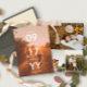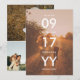 Dubblan sparar datumkortet med en modern, ren typografisk design som är fokuserad på bröllop-datumet på ett foto av paret lycklig. Lägg till ytterligare tre foton på baksidan i en ren kollage. Rensa personligen för datummallskortet med foton.