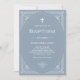 De här eleganterna Baptism-inbjudningarna har en modern centrifugering på klassisk konsthandling. Ett ornat, vitt geometriskt ram och kor dekorerar en vacker dammig blå bakgrund för en snyggt, vintage.