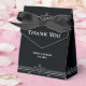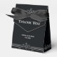De glamorösa bröllopsboxarna har en modern centrifugering på klassisk konsthandling. Ett ornat, vitt geometriskt ram och ornamentering dekorerar en elegantens mörk onyx svart bakgrund för ett dramatiskt utseende i vintage bröllop. På lådans framsida står "tack".