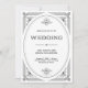 De glamorösa svarta och vita bröllopsinbjudningarna har en modern centrifugering på klassisk konsdeka. Ett ornat, svart geometriskt ram och ornamentering dekorerar en elegant vit bakgrund för ett dramatiskt vintage bröllop-utseende.