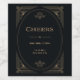 Dessa glamorösa etiketter bröllop vin flaska har en modern centrifugering på klassisk konst deco. Ett ornat, faux guld geometric ram och dekoration dekorerar en elegant mörk svart bakgrund för ett dramatiskt utseende, vintage bröllop. Ord "cheers" visas i ett klassiskt elegant-teckensnitt.