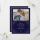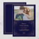 Dessa glamourösa bröllopskort 'save the date' har en modern twist på klassisk art deco. En utsmyckad, falsk roséguldgeometrisk ram och ornamentik dekorerar en elegant mörk marinblå bakgrund med ditt favoritpersonliga foto för en dramatisk, vintagebröllopslook.