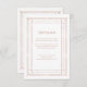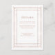 Dessa glamorösa bröllop-gästkort har en modern centrifugering på klassisk konsthandling. Ett ornat, faux ro guld ser geometriskt ut ram och prydnadation dekorerar en elegant vit bakgrund för ett dramatiskt utseende, vintage bröllop. Du kan använda dessa kort för köranvisningar, mottagnings- eller transport-information, hotell- eller inkvarteringsinformation och alla andra bröllop-uppgifter som du behöver dina gäster för att veta.
