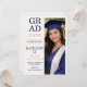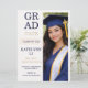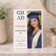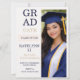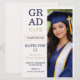 Modern design med delad layout med krämig texturerad bakgrund, fet staplade examens typografi och en vertikal porträttpanel i marinblå och champagnetoner. Designad för high school-examensannonser som framhäver ett seniorporträtt samtidigt som den delar detaljer om ceremonin och firandet.