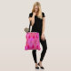 Tryckt med påse i en abstrakt, Mid Century Modern, ett varptryck av diamantformer, med vågrät stripe struktur, i skuggor av djup fuchsia rosa, korallets rosa, korallets orange och ljusviolett ljus