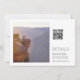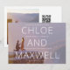 Den här moderna och minimalistiska bröllopsinbjudan innehåller ett foto på fullt med ett vackert och fetstilt överlägg som belyser parets namn. Datum och plats för huvudtypen. Baksidan av det här lyxbröllopsinbjudningskortet innehåller ytterligare ett foto och en QR-kod för att ge gästerna vägledning till bröllop webbplats för mer information. Den här bröllopsinbjudan är perfekt för ett par som söker en enkel och modern estetik som betonar parets fotografi och namn.