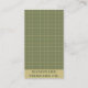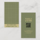 Utformning av affärskortet med en djup grönt som kontrolleras i mönster i en ren, minimal layout, med en QR-kod för snabb åtkomst till en webbplats eller portfölj. Lämplig för handgjorda klädmärken, professioneller för kreativ eller boutikföretag.