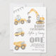 Modern Dump Allting Construction 1:a födelsedagsinbjudan Cute modern building 1:a födelsedagsinbjudan med olika fordon, grått bunting flagga och dekorativ text.