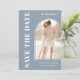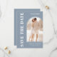 Den här moderna Spara Datumkortet har en snyggt Arch-fotomall och contemporary-typografi på en dammig blå bakgrund. Anpassade enkelt med ditt foto och information.