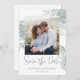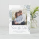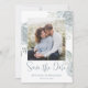 Den här vackra designen har sparan ett datum bröllop QR-kod med onlinens webbplats för mer information, en spara-till-datum-fotoenkel, med dammig blå blommigt grönenery foliage, en 1 foto-bild-layoutsmall, ett modernt elegant-paret som ägnar sig åt bild, en bröllop botaniska löv, förlovning foton budgetvykort, med trendigets kalligrafi-penselskript, ett chic som minimalistift för snyggt. elegant typografi, modernt calligraphy-skript, enkelt spara datumet med blommigt ro -mall