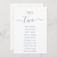 In the upper part, there is the table number written in a handwriting script and the word Table above, in smaller caps (hand letters). Under them, there are the 10 guest names, in similar hand letters. All text is dusty blue, the background is white.