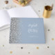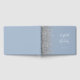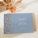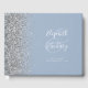 I gästen bok i elegant bröllop finns en lämnat gräns av Faux silver glitter på dammig blå bakgrund. Anpassa enkelt den vita texten med namn i bruden och trippen i den visuella handskriftssymbolen över ett stort, blått blek-format. Lägg till ytterligare text som du väljer framifrån och rygg.