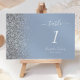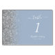 Det moderna bordsnumret bröllop i elegantens lämnat kant har en silver faux-utformning från glitter. Anpassadet kombinerar vit handskrift, tryckplåt och kursivt typsnitt på en dammig blå bakgrund.