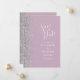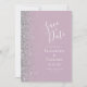 Det moderna bröllop spara datum-kortet från elegantens lämnat kant har ett silver faux glitter gräns. Anpassadet kombinerar vit handskrift, tryckplåt och kursivt typsnitt mot en dammig lilak bakgrund. Den omvända sidan har en dammig lilak- och silver-design som passar ihop.