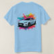 En digitalt illustrerad modern elbil som skildras mot ett vibrerande stänk av flerfärgad färg, där innovation och konst kombineras.