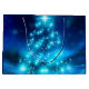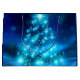 Giftväska med en modern elblå Julgran. Dekorerad med ljus överallt. Bakgrunden har avfärdat suddigt ljus.