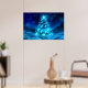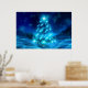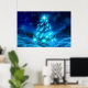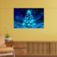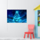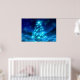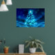 En poster med ett modernt elblått Julgran. Dekorerad med ljus överallt. Bakgrunden har avfärdat suddigt ljus.