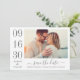 Modern och snyggt bröllop spara datum-annonskort har ett foto med förlovning av vågrät med en typografisk design som innehåller fet och elegant bröllop-datumnummer med ett enkelt monogram av bron och groom namn. Systemet för träkol-grått och vit färg.