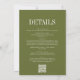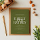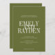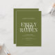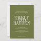 Bröllopbjudan har en minimalistisk utformning med oliv grönt bakgrund och en ren, symmetrisk layout. Det användor elegant serif typsnitt, med parets namn på en framträdande plats i stor, överlappande text för en djärv och modern beröring. De återstående detaljerna är ordnade i ett mindre, tydligt teckensnitt, vilket gör att du kan behålla enkelheten och sofistikeringen, blanda contemporary och traditionell estetik.