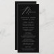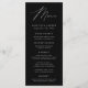 Enkel meny och elegant bröllop-meny med "Menu" som visas i ett modernt, vitt skript med en svart bakgrund med subtila vita glasögon. Anpassa menyn Svart bröllop genom att lägga till namn, datum och menyinformation för bröllop. Designad att samordna med vår moderna elegance bröllop-samling.
