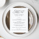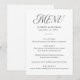 Lägg till en aning sofistikering till firande med vår elegant bröllop-meny! Med en unik modern typografi i stil som kombinerar färggrann vit kalligrafi med klassiskt serif-tecken, framhäver den här svarta och vita menydesignen tidlös elegans. Anpassa framsidan med namn, datum och menyalternativ för bröllop för att skapa ett anpassat utseende. Den här mångsidiga menyn mäter 5 x 7 tum och är perfekt för modern bröllop, repetitionsmiddagar, förlovningsfester med mera. Gör en snyggt påstående med den här vackra menyn!