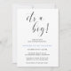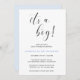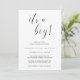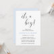 Typografi-babyduschinbjudan med ord, "det är en pojke!" i svart kalligrafi med ett hjärta som prickar "i" och i slutet av utropningspunkten över en vit bakgrund. Namn på hedersgästen och baksidan är pastellblå och kan ändras till valfri färg. Den enkla och minimala layouten och mängden öppet utrymme ge är en modern känsla.