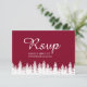 Färdigställ din vinterbröllopssvit med dessa eleganta svarsbrevskort. Med en rik mörkröd burgunderfärgad bakgrund och mjuka, vita silhuetter av tallar, ger dessa svarsbrevskort en touch av skogscharm till din speciella dag. Den förfinade stilen tillför sofistikation, medan den enkla layouten gör det enkelt för gästerna att svara. Förutom alternativ för närvaro, innehåller varje kort avsnitt för måltidsval och kostrestriktioner, vilket säkerställer en personlig och genomtänkt touch för dina gäster. Dessa svarsbrevskort är idealiska för alla vinterfiranden, från intima sammankomster till stilfulla skogsinspirerade evenemang. Anpassningsbara med dina föredragna svarsdetaljer.