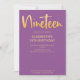 Inför en ny modern elegant 19:e födelsedagsfest inbjudan med lila bakgrund med handskriven typografiktext från guld som säger nitton". Anpassa det här mallkortet genom att lägga till egen party-information.