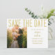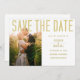 Unikt bröllop-foto sparar datumet. Vit bakgrund. Guld (guld är inte guld utan färg). Modern, strömlinjeformad teckensnitt. Helt unik, enkel och elegant. För sommaren bröllop, vår bröllop eller något slags modernt elegant bröllop.