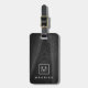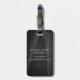 Bagagetagg med ditt monogram initialt inuti en kvadrat, vit gräns och namn på en tryckt svart bakgrund av trälåda. Lägg till kontaktinformationen på baksidan.