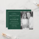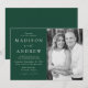 Modern fotobröllopsinbjudan som innehåller dina bröllop-detaljer på den lämnat designen i vit skrift med calligraphy-skript-accents på mörk grönt bakgrund. Anpassa framsidan av inbjudan genom att lägga till namn, bröllop-information och lodräts förlovning-foto. Baksidan av inbjudan ger utrymme för ytterligare text och foton. Designad att samordna med vår moderna elegance bröllop-samling.