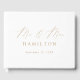 Elegant bröllop-gästbok med texten "Mr and Mrs" som visas i ett modernt kalligrafi-skript i guld på vit bakgrund. Anpassa framsidan av den enkla gästen bröllop bok med efternamn och bröllop datum. Baksidan av gästen bok visningar förlovningen av vågrät. Lägg till ditt gift namn och bröllop till fotogästen bok.