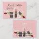 Ett flickaktigt rosa kvinnligt ror av makeupprodukter med blommönsterbakgrund. En kvinnlig konstnärlig beställnings- visitkortillustration för djärv kvinna med cosmetologisttext och makeup och läppstift. Design för idealmakeupkonstnär för stylister, makeupkonstnärer och cosmetologists.
