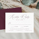 Minimalistiskt, modernt bröllop OSA-kort med ditt OSA-datum, anpassningsbarna accepterar/avvisar formuleringar och måltider. "Vänligt svar" visas i ett calligraphy-skript för vin-lila. Det lila skriptkortet för bröllop OSA var designat att samordna med vår Modern Elegance bröllop samling.