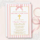Modern Elegant Pink Blush Striped First Holy Communion Invitation includes Pink and White Stripes, Gold Frame, Gold Cross and Pink Bow Ribbon.